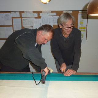 Am 27.12.2017 haben sich einige Spieler im Billardraum getroffen um unserem grossen Billardtisch, dessen altes Tuch deutlich in die Jahre gekommen ist, wieder zu neuem Glanz zu verhelfen. Das alte Tuch, das schon einige Löcher aufwies und auch schon einige Jahre auf dem Buckel hatte wurde entfernt und durch ein neues Tuch ersetzt. Ebenso die Bespannung der Banden. Wir freuen uns nun über ein neuwertiges Matchbillard das wieder Wettkampfstandards entspricht...