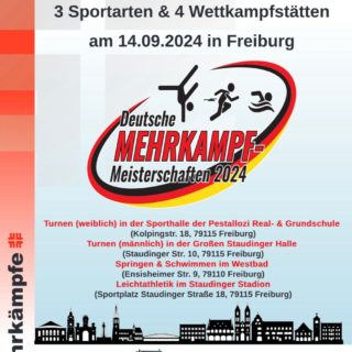 Am 14. September 2024 finden die Deutschen Mehrkampfmeisterschaften in Freiburg statt! An 4 Wettkampfstätten treten die Mehrkämpfer in 3 verschiedenen Sportarten (Turnen, Wasserspringen/Schwimmen und Leichtathletik) gegeneinander an. Mit dabei die Lokalmatadorin und zwölffache Deutsche Meisterin vom PTSV Jahn Freiburg, Sabine Storz. Wir freuen uns schon sehr auf das große Event und vor allem auf viele begeisterte Zuschauer.